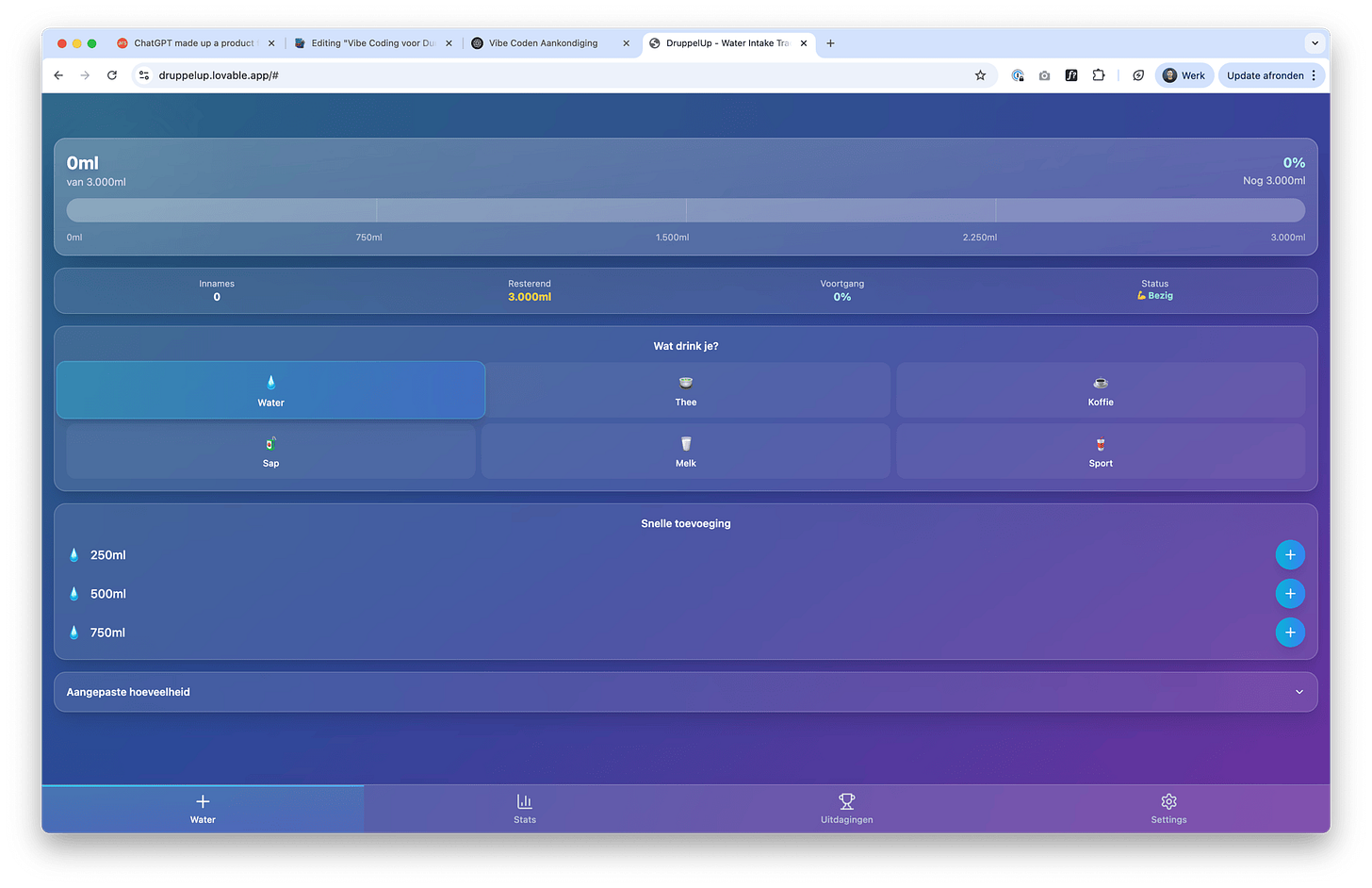 Zondag ging het het dak eraf. Ik maakte een Midjourney-prompt voor een fris logo, liet Lovable push-notificaties genereren – “Stuur elke twee uur een drink-reminder” – en drukte op Publish. De precieze deploy-script hoefde ik niet eens te lezen: één klik en Druppelup.nl was gelanceerd. Probeer ‘m zelf!